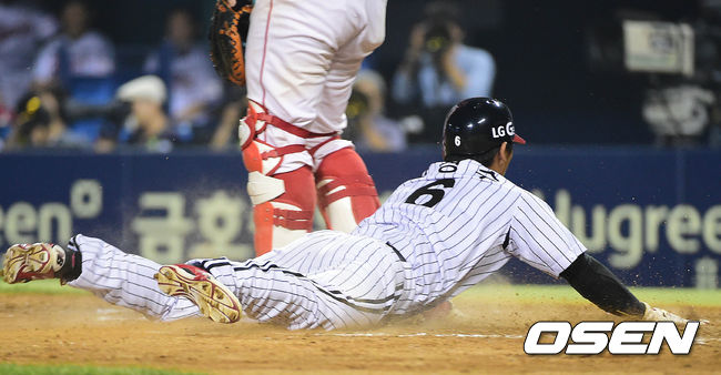 7회말 LG 공격 2사 1, 3루 상황 SK 투수 진해수의 1루 견제 때 3루주자 박경수가 홈스틸을 성공시키고 있다.