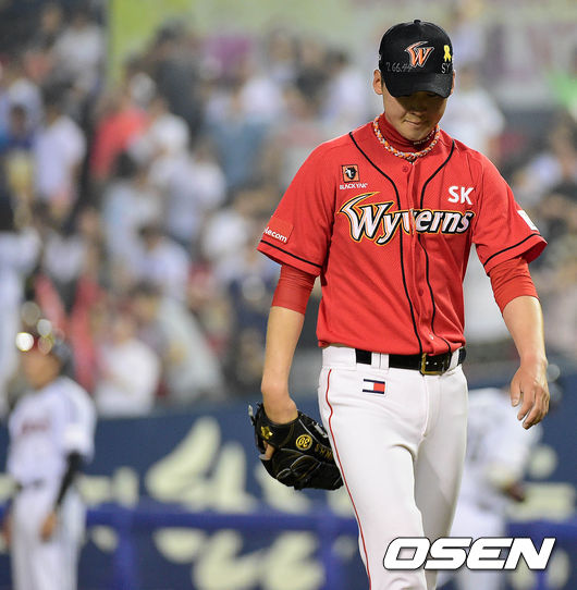 7회말 LG 공격 2사 1, 3루 상황 오지환에게 역전 내야안타를 허용한 SK 투수 진해수가 이닝을 마친 뒤 아쉬운 표정으로 더그아웃으로 들어오고 있다.