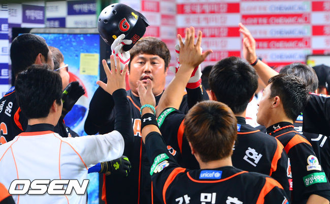 13일 부산 사직구장에서 열린 2014 한국야쿠르트 세븐 프로야구 롯데 자이언츠와 KIA 타이거즈의 경기,7회말 2사 롯데 최준석이 솔로홈런을 날린뒤 동료들의 축하를 받고 있다.