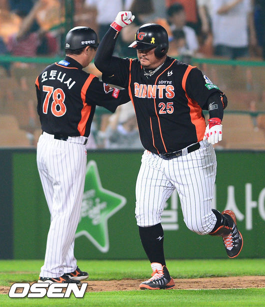 13일 부산 사직구장에서 열린 2014 한국야쿠르트 세븐 프로야구 롯데 자이언츠와 KIA 타이거즈의 경기,7회말 2사 롯데 최준석이 솔로홈런을 날린뒤 모토니시 3루 코치와 하이파이브를 하고 있다.