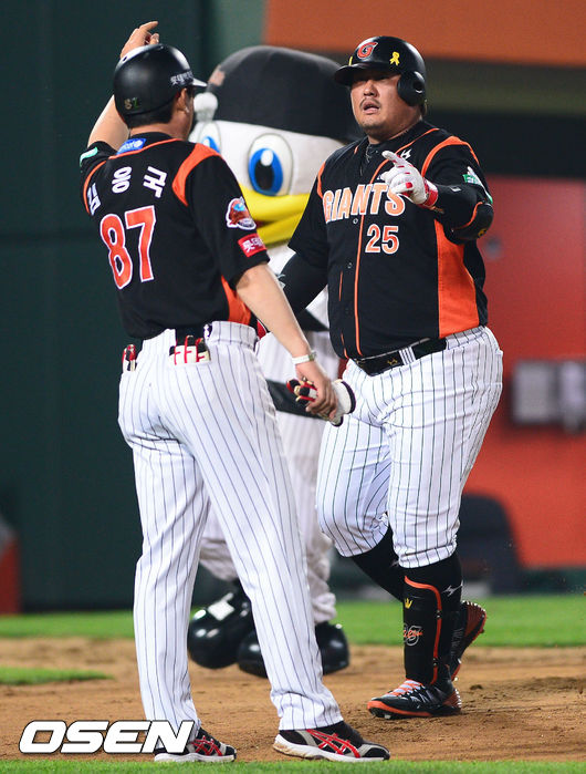 13일 부산 사직구장에서 열린 2014 한국야쿠르트 세븐 프로야구 롯데 자이언츠와 KIA 타이거즈의 경기,7회말 2사 롯데 최준석이 솔로홈런을 날린뒤 동료들의 축하를 받고 있다.