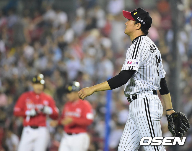 9회초 SK 공격 1사 2, 3루 상황 대타 안정광에게 역전 적시 2타점 좌중간 안타를 허용한 LG 마무리투수 봉중근이 아쉬워하고 있다.