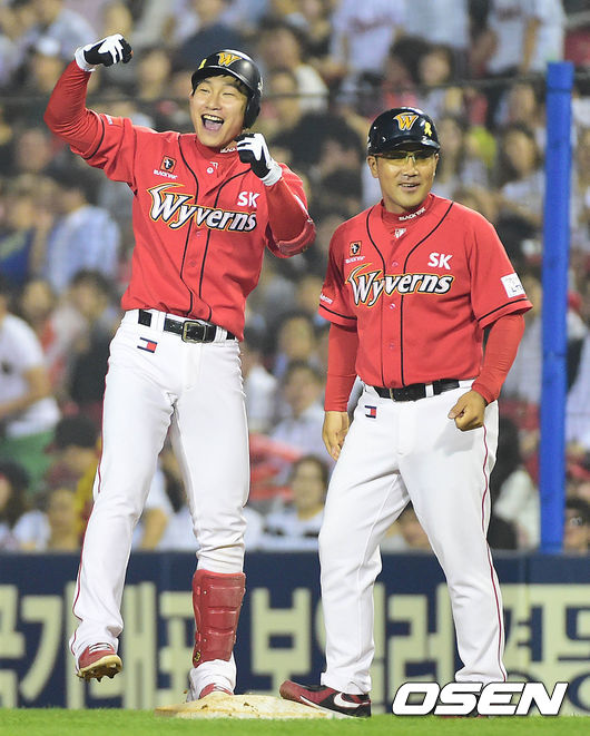 9회초 SK 공격 1사 2, 3루 상황 대타 안정광이 역전 적시 2타점 좌중간 안타를 날리고 1루에 안착해 환호하고 있다.