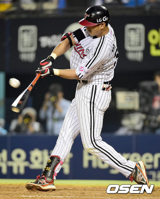 9회말 LG 공격 1사 2, 3루 상황 박용택이 내야를 살짝 넘어가는 추격의 1타점 적시타를 날리고 있다.