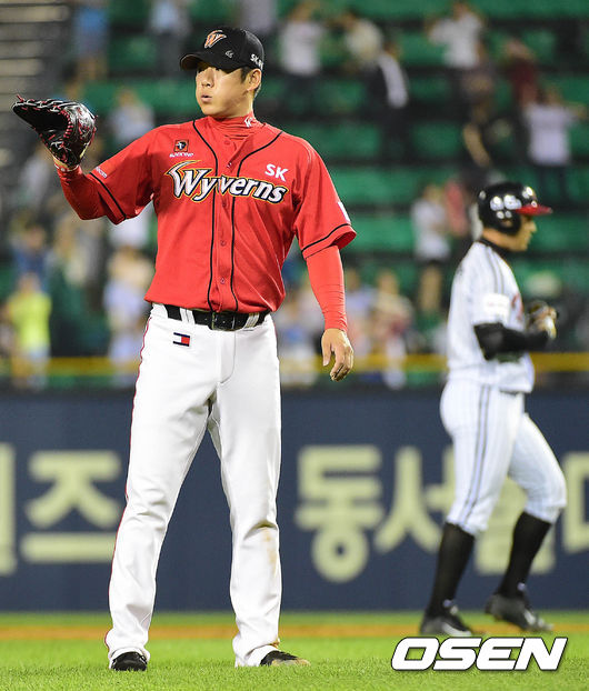 9회말 LG 공격 1사 1, 3루 상황 오지환에게 동점 1타점 2루타를 허용한 SK 투수 박희수가 아쉬워하고 있다.