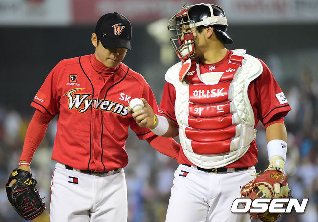 9회말 LG 공격 때 마운드에 올라 2실점하며 블론세이브한 SK 투수 박희수와 포수 정상호가 더그아웃으로 들어오며 대화를 나누고 있다.