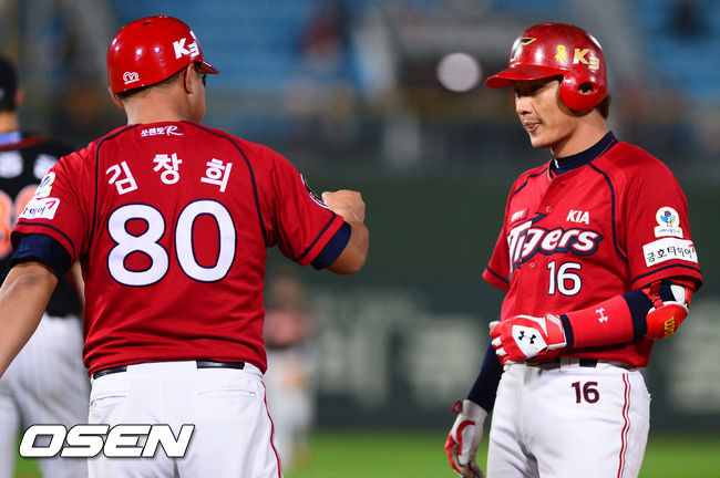 9회초 2사 1,2루 KIA 김주찬이 1타점 적시타를 날리고 김창희 코치와 하이파이브를 하고 있다./soul1014@osen.co.kr
