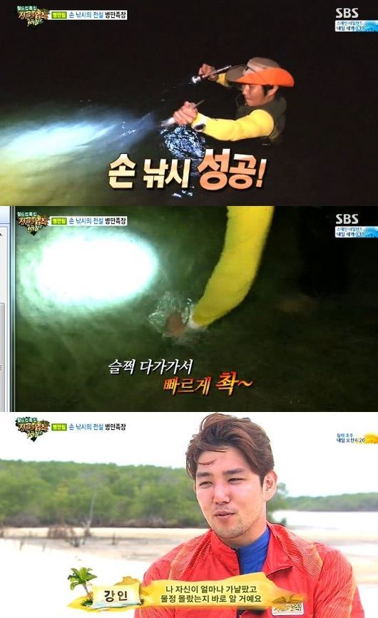 이를 보던 강인도 맨손 물고기 잡기에 도전했다. 그러나 쉽지 안은 일이었다. 그는 "아무리 생각해도 미스터리다. 어떻게 맨손으로"라며 경악을 금치 못했다.