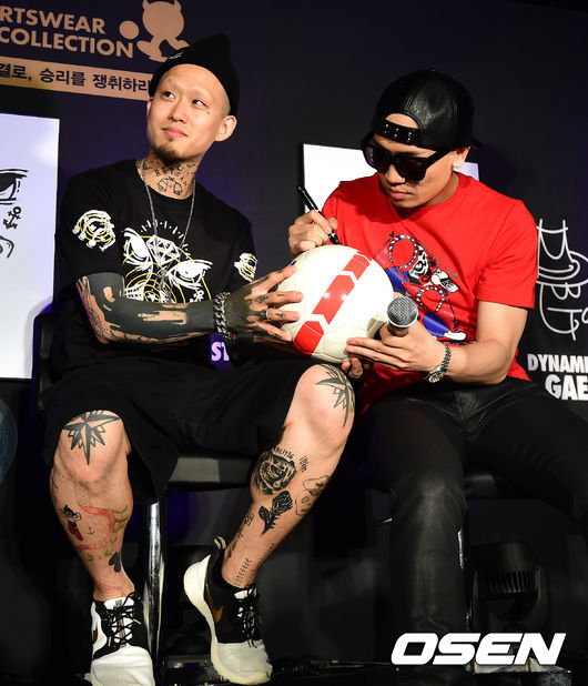 타투 아티스트 노보와 다이나믹듀오 개코가 축구공에 사인을 하고 있다.