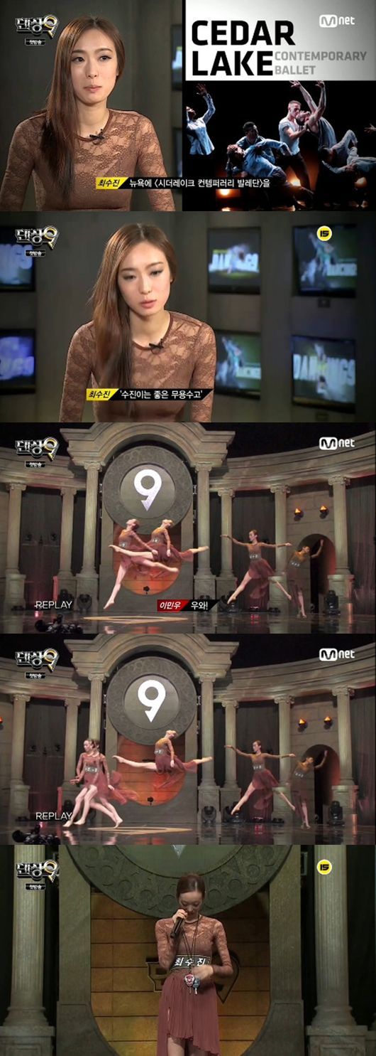 13일 첫 방송된 Mnet '댄싱9‘ 시즌 2에는 뉴욕 시더레이크 컨템퍼러리 발레단에서 활동했던 현대무용가 최수진이 등장해 감동적인 무대를 선보였다.
