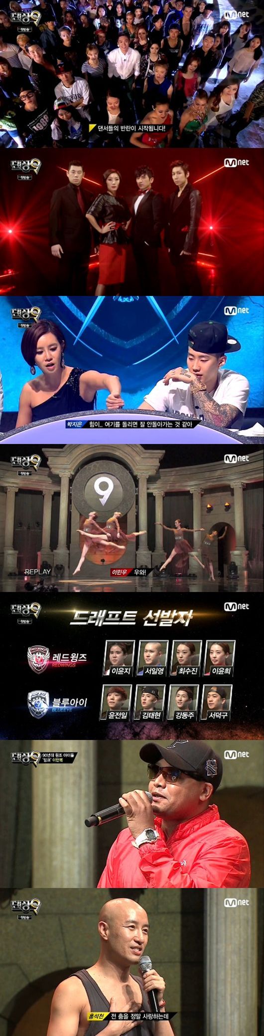 13일 첫 방송된 Mnet '댄싱9‘ 시즌 2는 200여명 댄서들의 웅장한 군무로 포문을 열었다. 이어 레드윙즈 마스터 박지우, 우현영, 이민우, 하휘동은 2연속 우승을 자신했고, 블루아이 박지은, 이용우, 박재범, 김수로는 "에이스를 영입해 최상의 결과를 선보이겠다"며 승부욕을 불태웠다.