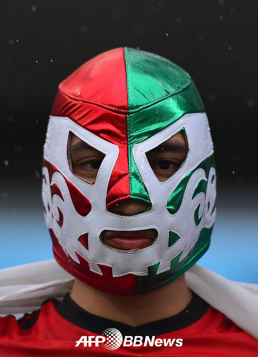 경기에 앞서 멕시코 남성팬이 가면을 쓰고 응원을 하고 있다.