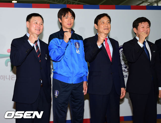 [OSEN=브라질 이구아수, 민경훈기자] 13일 오후(현지시간) 홍명보감독이 이끄는 축구대표팀이 이구아수(이과수)의 페드로 바소경기장에서 훈련을 할 예정인 가운데 코리아 하우스 개관식이 열리고 있다. 축구대표팀 홍명보 감독이 허정무 대한축구협회 부회장, 정몽규 대한축구협회 회장, 김정태 하나금융그룹 회장과 함께 포토타임을 갖고 있다.