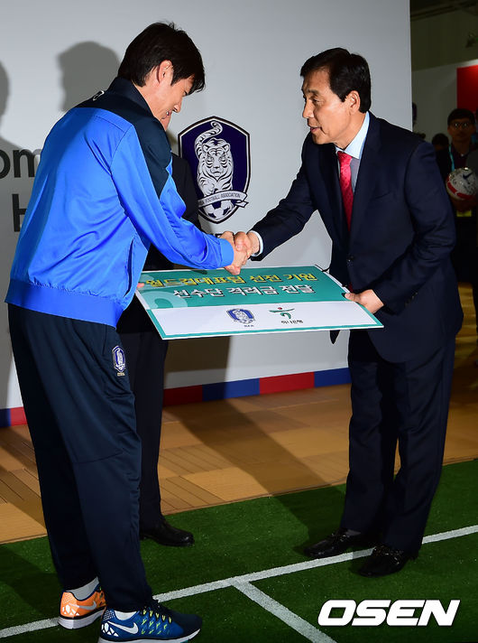 [OSEN=브라질 이구아수, 민경훈기자] 13일 오후(현지시간) 홍명보감독이 이끄는 축구대표팀이 이구아수(이과수)의 페드로 바소경기장에서 훈련을 할 예정인 가운데 코리아 하우스 개관식이 열리고 있다. 축구대표팀 홍명보 감독이 김정태 하나금융그룹 회장에게 선수단 격려금을 전달 받고 있다.