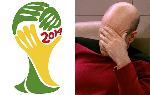 2014 브라질 월드컵의 로고는 노란 손의 모양을 하고 있는 것처럼 보인다는 지적을 받아왔다. 이 로고가 월드컵 트로피를 나타내기 보다는 실망스러워 손바닥을 얼굴에 대고 있는 모습과 더 비슷하다는 평가를 받고 있다. 또한 야후 스포츠는 이 모습을 월드컵에서 탈락한 팀이 짓게 될 포즈라고 재치 있게 표현했다.