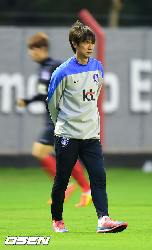 [OSEN=브라질 이구아수, 민경훈기자] 13일 오후(현지시간) 홍명보감독이 이끄는 축구대표팀이 이구아수(이과수)의 페드로 바소경기장에서 훈련을 가졌다. 홍명보 감독이 생각에 잠겨있다.