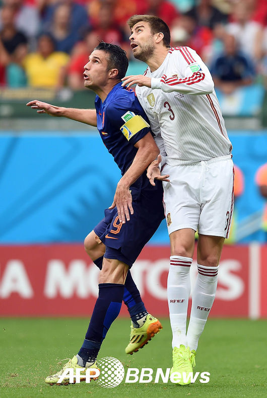 전반 스페인 헤라르드 피케와 네덜란드 로빈 반 페르시가 공중볼 다툼을 하고 있다.
