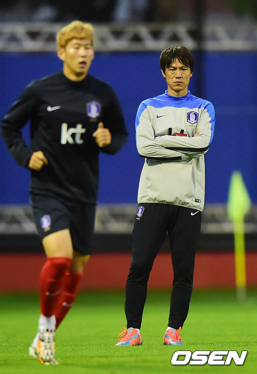 [OSEN=브라질 이구아수, 민경훈기자] 13일 오후(현지시간) 홍명보감독이 이끄는 축구대표팀이 이구아수(이과수)의 페드로 바소경기장에서 훈련을 가졌다. 홍명보 감독이 생각에 잠겨있다.