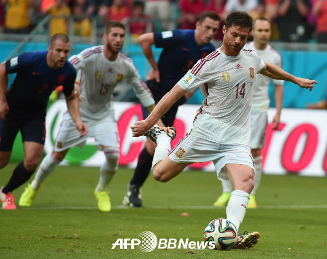 전반 스페인 사비 알론소가 페널티킥 슛을 시도하고 있다.