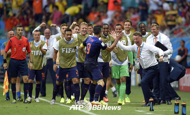 전반 네덜란드 로빈 반 페르시가 골을 성공시키고 루이스 반 할 감독과 하이파이브를 하고 있다.