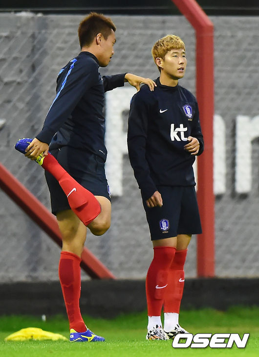 [OSEN=브라질 이구아수, 민경훈기자] 13일 오후(현지시간) 홍명보감독이 이끄는 축구대표팀이 이구아수(이과수)의 페드로 바소경기장에서 훈련을 가졌다. 손흥민과 김신욱이 몸을 풀고 있다.