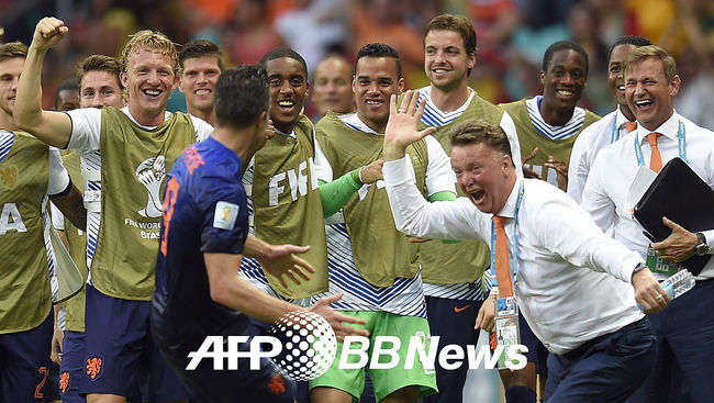 전반 네덜란드 로빈 반 페르시가 골을 성공시키고 루이스 반 할 감독과 하이파이브를 하고 있다.
