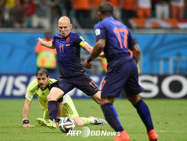 네덜란드는 14일(한국시간) 브라질 살바도르 아레나 프론테 노바에서 열린 2014 브라질 월드컵 B조 1차전 스페인과 경기서 5-1의 대승을 거뒀다. 지난 2010 남아공 월드컵 결승전서 눈물의 패배를 당했던 네덜란드는 스페인을 농락하며 리턴매치서 복수에 성공했다. 네덜란드는 로빈 반 페르시와 아르연 로벤이 2골씩 뽑아내며 공격을 이끌었다.