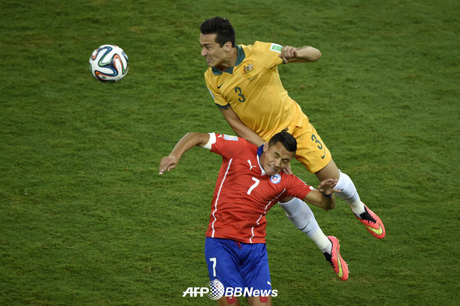 전반 호주 제이슨 데이비슨과 칠레 알렉시스 산체스가 공중볼 다툼을 하고 있다.