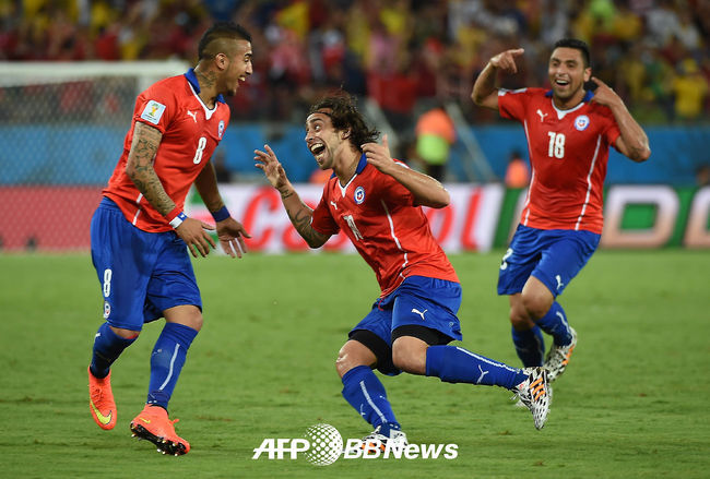 전반 칠레 호르헤 발디비아가 골을 성공시키고 환호하고 있다.