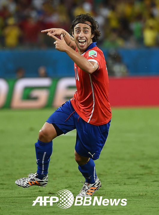 전반 칠레 호르헤 발디비아가 골을 성공시키고 환호하고 있다.
