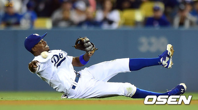 8회초 무사 LA 다저스 디 고든이 애리조나 힐의 타구를 잡아 1루로 송구하고 있다. 결과는 1루 세이프.