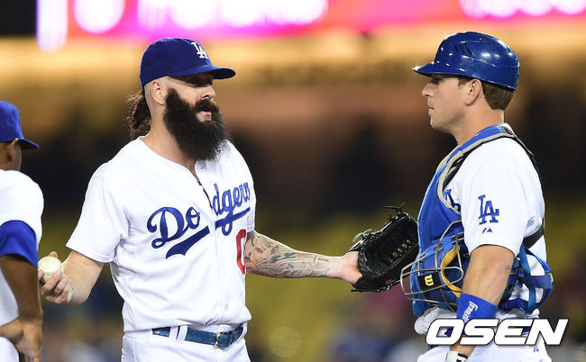 8회초 1사 1,2루 LA 다저스 브라이언 윌슨이 애리조나 고드비쉬에게 적시타를 허요한 뒤 A.J 엘리스와 이야기를 나누고 있다.