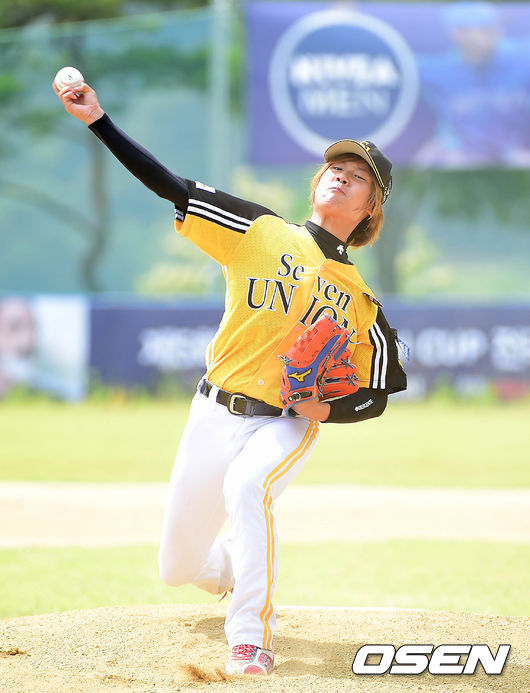 세븐유니온 선발 이동주가 힘차게 공을 뿌리고 있다.
