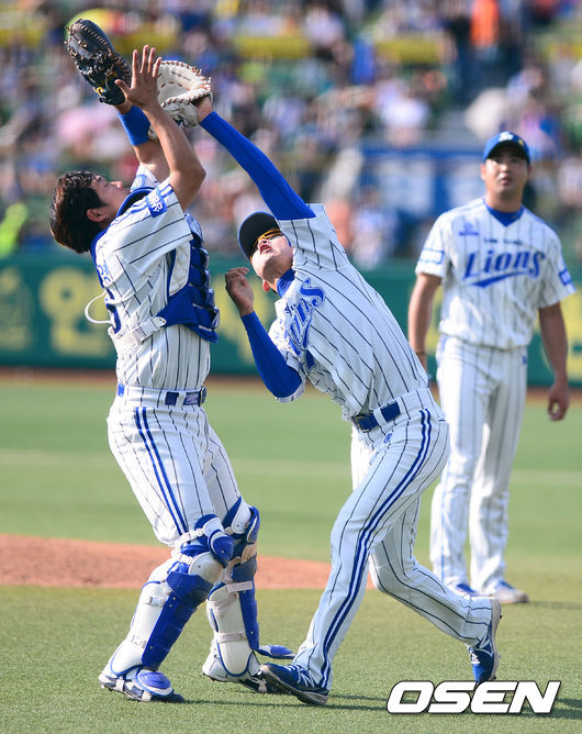 14일 오후 대구구장에서 열린 2014 한국야쿠르트 세븐 프로야구 삼성 라이온즈와 두산 베어스의 경기, 1회초 1사 두산 허경민의 내야 플라이때 삼성 이지영 포수가 타구를 잡아내고 있다.