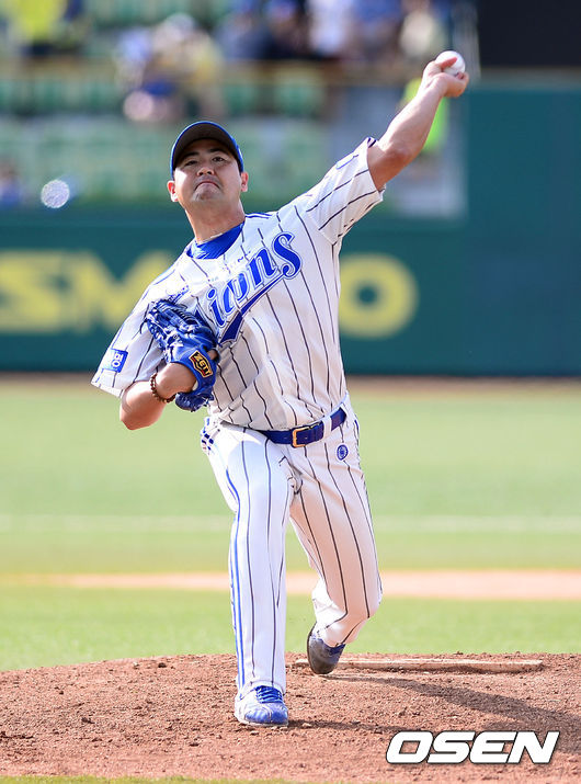 14일 오후 대구구장에서 열린 2014 한국야쿠르트 세븐 프로야구 삼성 라이온즈와 두산 베어스의 경기, 1회초 삼성 선발투수 장원삼이 역투하고 있다.