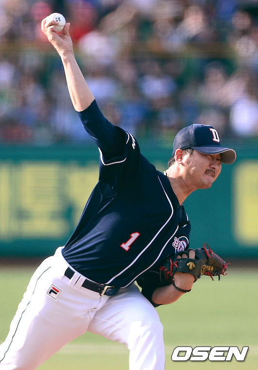 14일 오후 대구구장에서 열린 2014 한국야쿠르트 세븐 프로야구 삼성 라이온즈와 두산 베어스의 경기, 1회말 두산 선발투수 이재우가 역투하고 있다