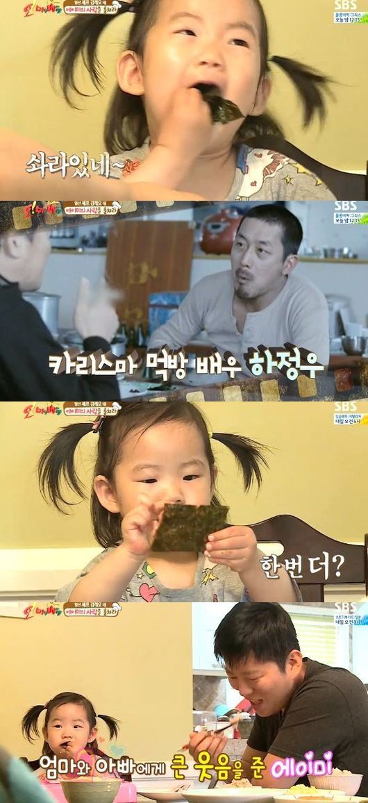 에이미는 14일 오후 방송된 SBS 예능프로프램 '오 마이 베이비'에서 강레오, 박선주와 함께 아침을 먹던 중 좋아하는 음식인 김을 정신없이 먹었다.