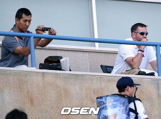 14일 오후 서울 잠실구장에서 열린 '2014 한국야쿠르트 세븐 프로야구' LG 트윈스와 SK 와이번스의 경기, SK 김광현이 선발 등판하자 메이저리그 스카우터들이 김광현의 경기를 관람하고 있다.
