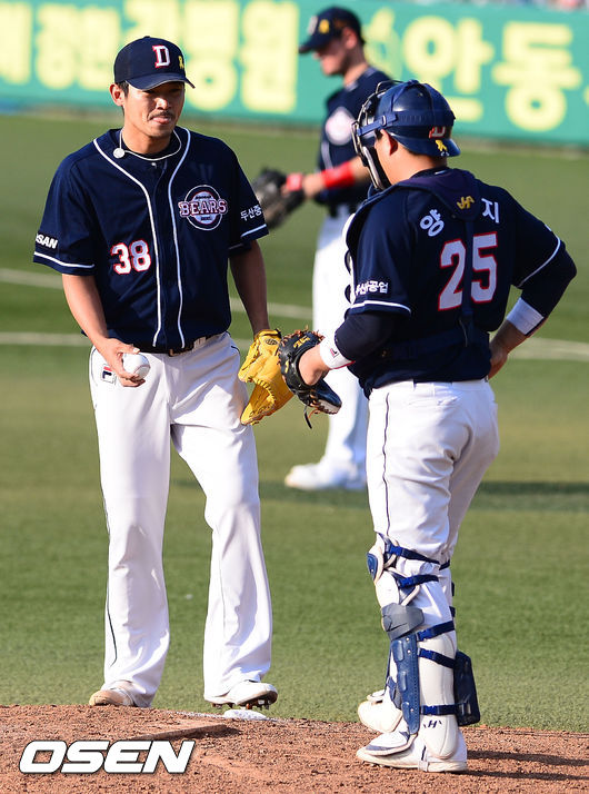 14일 오후 대구구장에서 열린 2014 한국야쿠르트 세븐 프로야구 삼성 라이온즈와 두산 베어스의 경기, 2회말 2사 2,3루 두산 노경은이 이재우와 교체되어 마운드에 오르고 있다