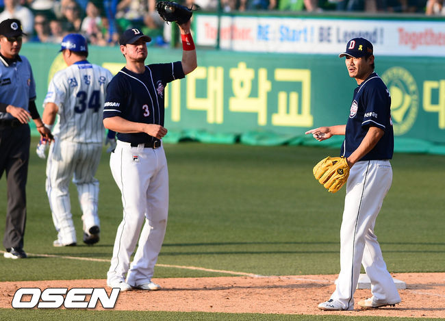 14일 오후 대구구장에서 열린 2014 한국야쿠르트 세븐 프로야구 삼성 라이온즈와 두산 베어스의 경기,4회말 1사 1,2루 삼성 최형우의 내야땅볼때 병살찬스를 놓친 노경은이 아쉬워하고 있다.