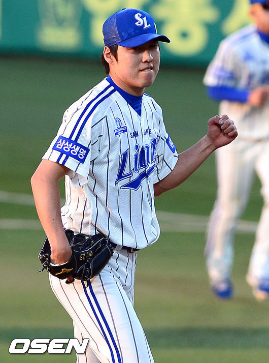 14일 오후 대구구장에서 열린 2014 한국야쿠르트 세븐 프로야구 삼성 라이온즈와 두산 베어스의 경기,6회초 2사 만루 위기를 삼진아웃으로 넘긴 삼성 차우찬 투수가 주먹을 쥐며 환호하고 있다.