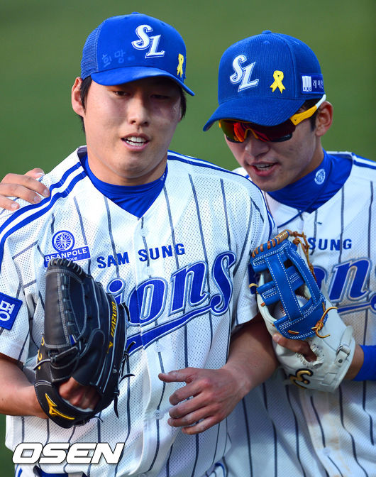 14일 오후 대구구장에서 열린 2014 한국야쿠르트 세븐 프로야구 삼성 라이온즈와 두산 베어스의 경기,6회초 2사 만루 위기를 삼진아웃으로 넘긴 삼성 차우찬 투수가 박해민과 이야기를 하며 더그아웃으로 들어가고 있다.