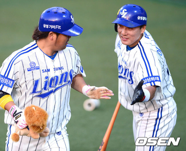 14일 오후 대구구장에서 열린 2014 한국야쿠르트 세븐 프로야구 삼성 라이온즈와 두산 베어스의 경기,6회말 삼성 선두타자 박석민이 솔로홈런을 날리고 동료들의 축하를 받고 있다.