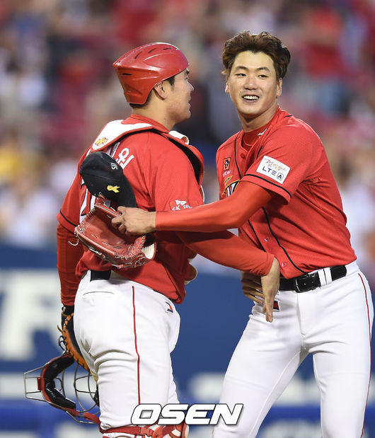 김광현이 경기 종료후 이재원 포수와 완투승의 기쁨을 나누고 있다./ ajyoung@osen.co.kr