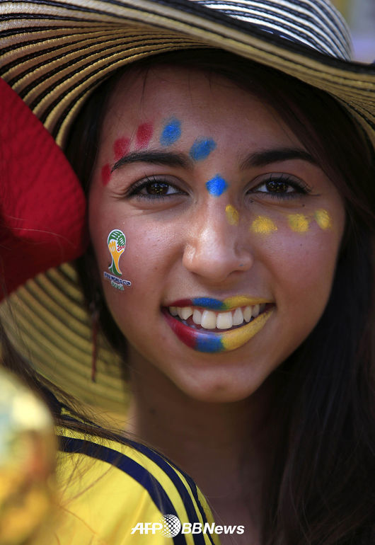 경기에 앞서 콜롬비아의 여성팬이 취재진을 향해 미소를 짓고 있다.