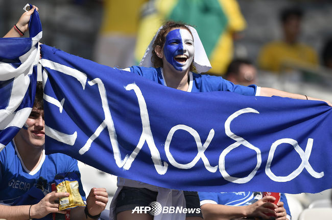 경기에 앞서 그리스의 여성팬이 열띤 응원전을 펼치고 있다.