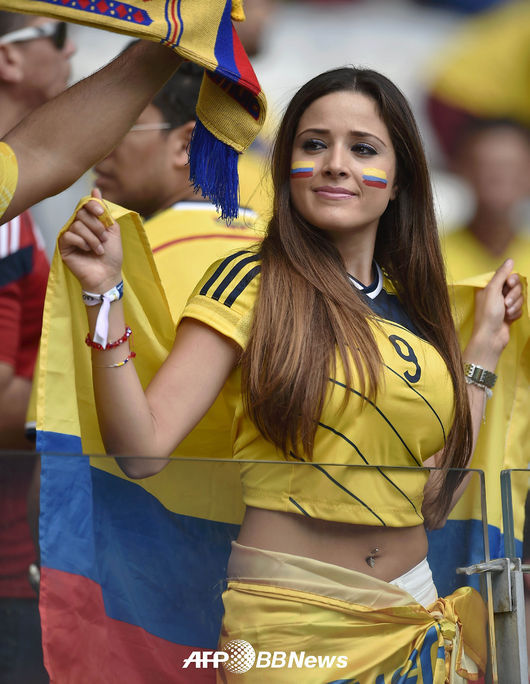 경기에 앞서 콜롬비아의 여성팬이 취재진을 향해 포즈를 취하고 있다.