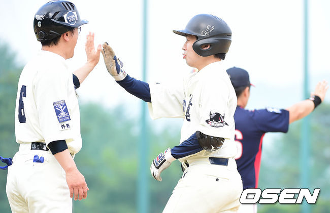 2회말 해커스야구단 공격 무사 3루 상황 홍경석이 1타점 중전안타를 날리고 1루에 안착해 코치와 인사를 나누고 있다.