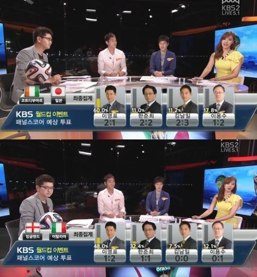 KBS 이영표 해설 위원이 스페인의 대패를 예상한 것에 이어 코트디부아르-일본 경기와 잉글랜드-이탈리아의 스코어를 완벽하게 예측했다.