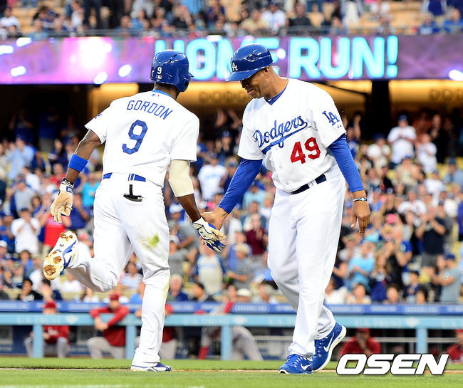3회말 2사 2루 LA 다저스 디 고든이 투런 홈런을 때린 뒤 베이스를 돌고 있다.